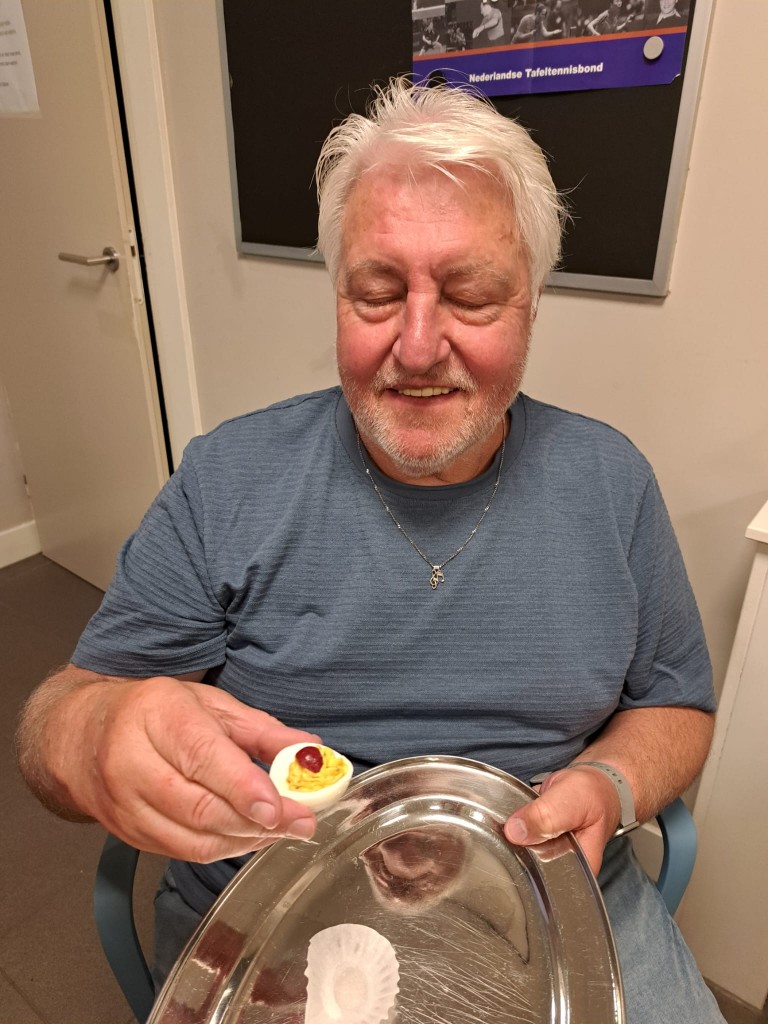 De dirigent wil nog wel eens een ‘boete’ opleggen in de vorm van ‘tracteren op gevulde eieren’ als er (ondanks er van tevoren op gewezen is) fout wordt gezongen. Nog nooit is er na zo’n waarschuwing fout gezongen dus ook nog nooit kwamen er gevulde eieren. Om toch de wens van de dirigent te laten uitkomen verschenen er na de gezellige laatste repetitie meerdere schalen met gevulde eieren waaraan iedereen zich tegoed kon doen.
